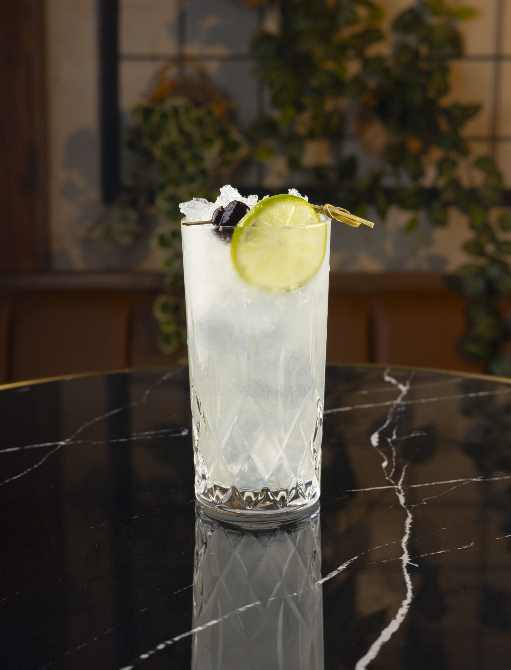 Gin Praga, limón natural, agua con gas, syrup simple.